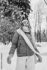 Happy young woman walking in snowy winter park wearing blue coat. Girl enjoys landscape wearing hat and mittens