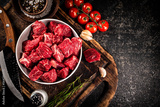 Pieces of raw beef in a bowl with tomatoes, spices and rosemary.