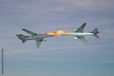 Two passenger planes collided in the sky, the crash of airliners.Concept: plane crash, plane crash, nose to nose, dispatchers' mistake, planes crashed into each other.