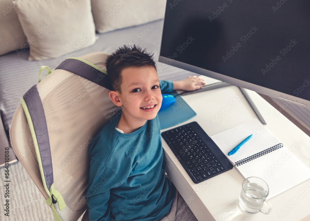 Distance learning online education. Back to school. Cute kid boy studying at home with computer and doing school homework. Thinking child sitting at table with computer.