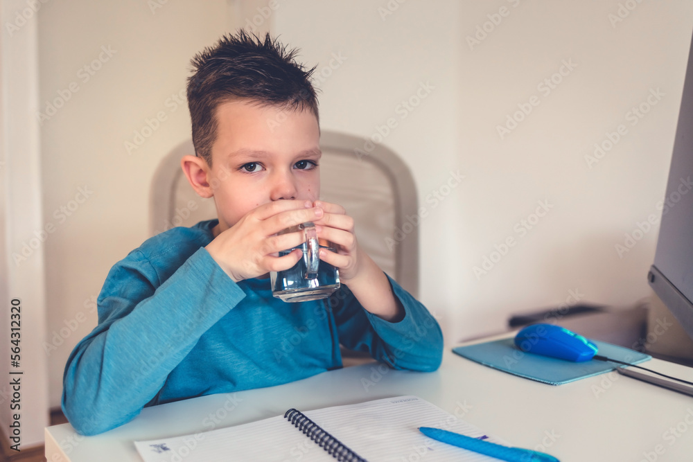 Positive young boy with holding glass of water while studying at home, sitting at table in front of computer, copy space, schoolers healthy lifestyle concept.