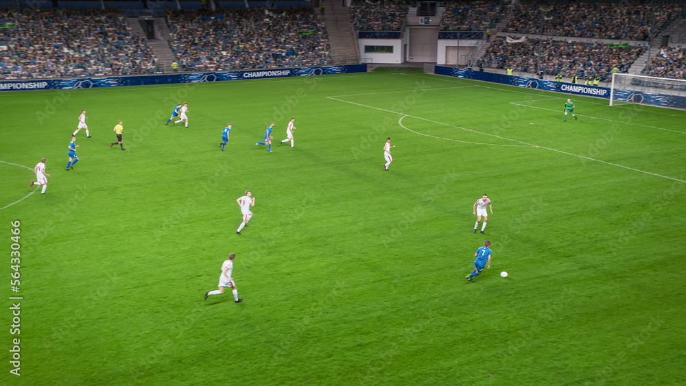 Soccer Football Championship Stadium with Crowd of Fans: Blue Team Forward Attacks, Dribbles, White Team Defending The Goals, Ready To Counterattack. Sports Channel TV Broadcast. High Angle.