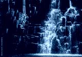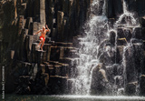 Middle-aged man jumping in waterfall lake. Falling water streams flow on black volcanic stone cascades. Rochester Falls waterfall - popular tourist spot in Savanne district in Mauritius.