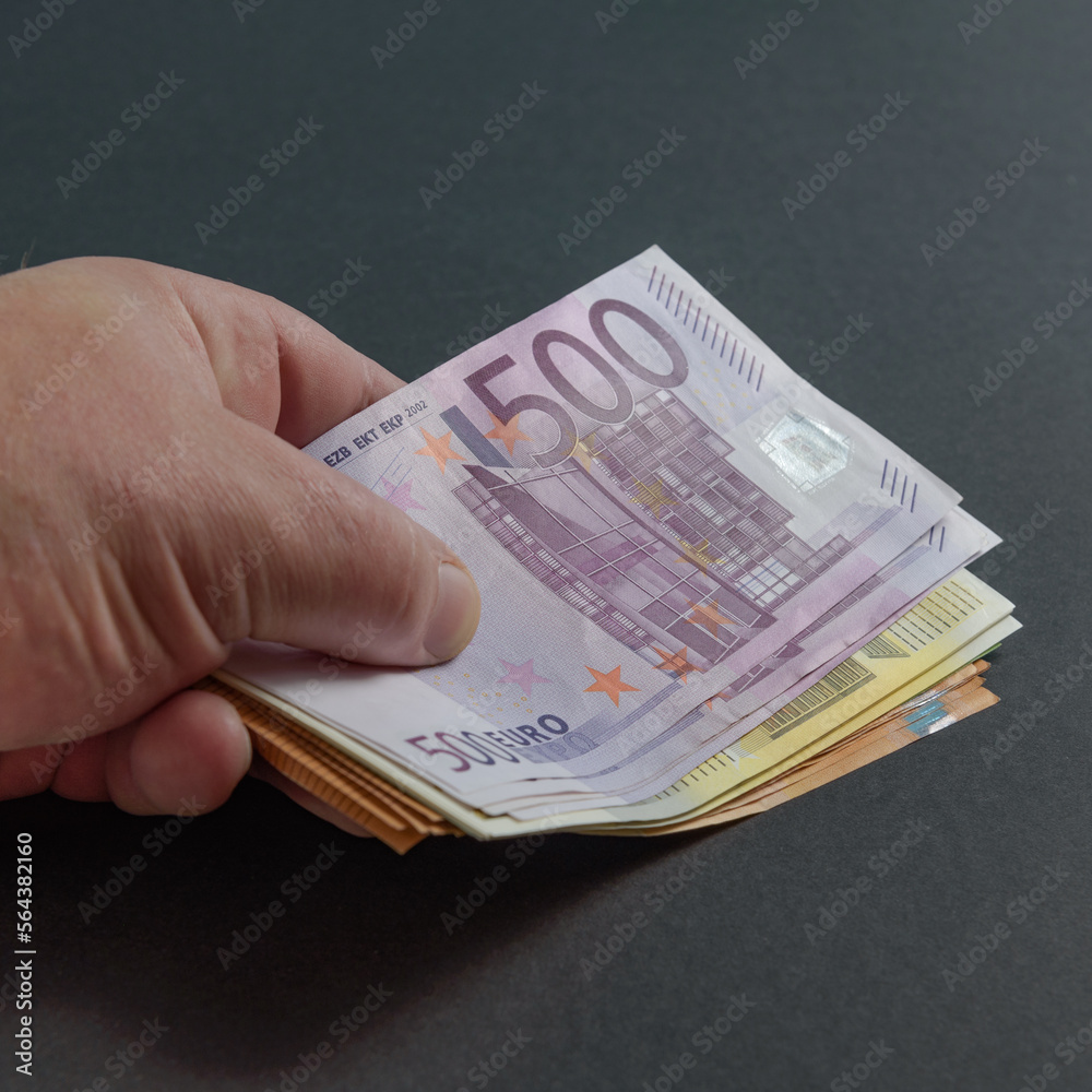 Euro cash. Large banknotes amount in the hand close-up. Black background