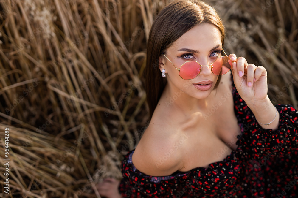 portrait of a beautiful young woman in red sunglasses in a summer field