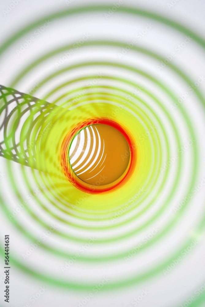 Abstract colorful background. Flexible rainbow children's retro toy with shadows on a white background. Slinky. Anti-stress toy. Flexibility symbol. Retro or vintage aesthetic. Nostalgia 90s concept