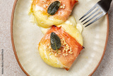 Appetizer. Baked tomino cheese with smoked speck, almonds, sage and honey.