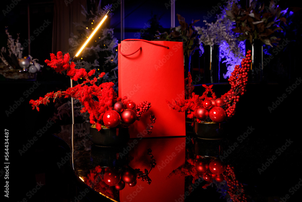 Red paper shopping bag on the reflective table. Gifts and presents for a holidays.