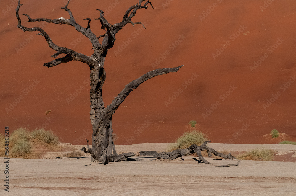 Landscape shot of the iconic dead trees of the Namibian deadvlei area.