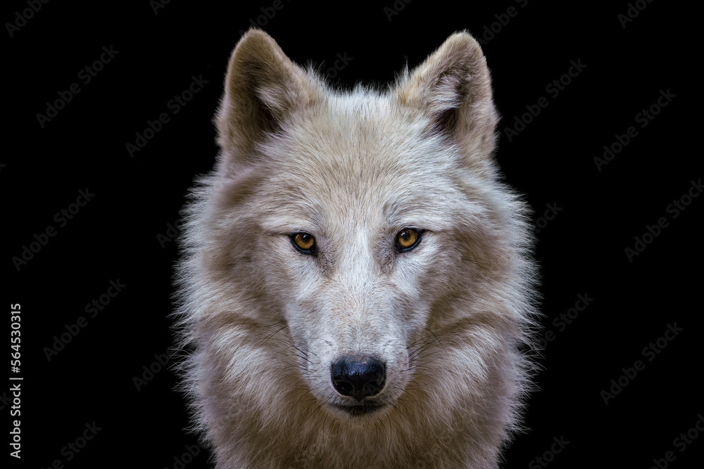 Portrait of arctic wolf isolated on black background. Polar wolf.