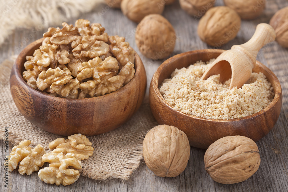Walnuts in wooden bowls