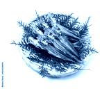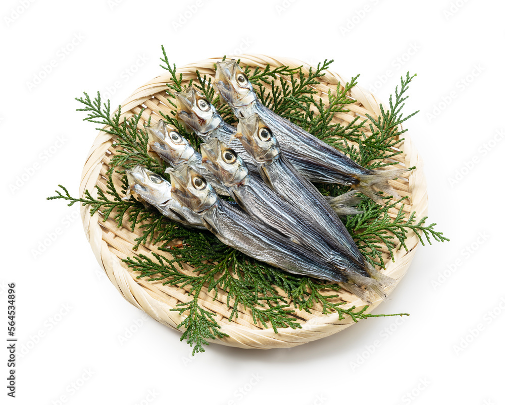 A colander placed on a white background with a serving platter of Japanese sardines.