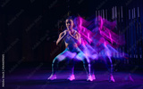 Workout at gym. Sportive woman in sportswear and sportsfoot training in modern fitness room over dark background with mixed neon light. Active and healthy lifestyle