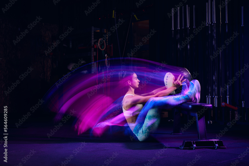 Workout at gym. Sportive woman in sportswear and sportsfoot training in modern fitness room over dark background with mixed neon light. Active and healthy lifestyle