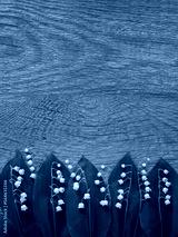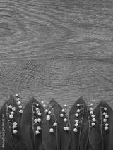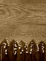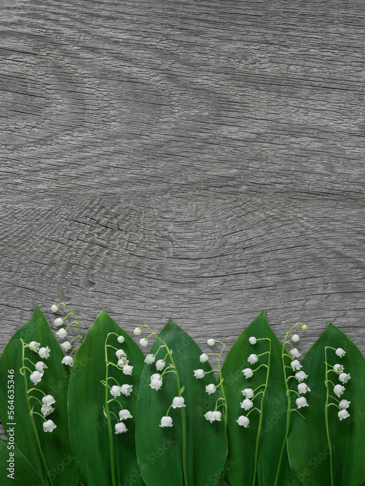 may lilies on wooden background, Lily of the Valley on grey wooden table, top view, copy space