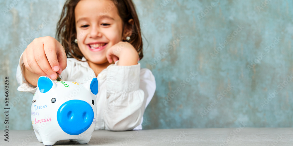girl with wavy brown hair on defocused background throwing coins into piggy bank in foreground