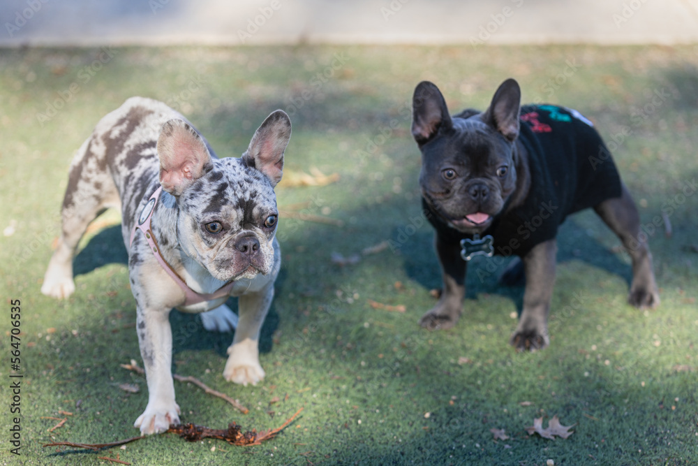 Blue-Merle and Blue French Bulldogs Socializing. Off-leash dog park in Northern California.