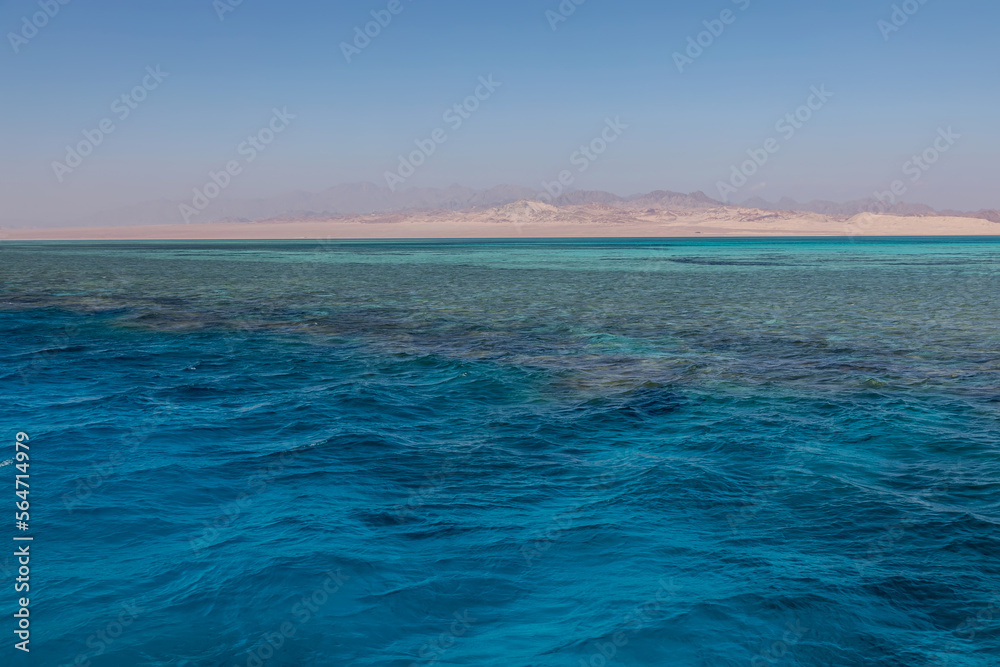 Beautiful blue sea. Colorful sea water. Sunny summer day. Shore in the distance.