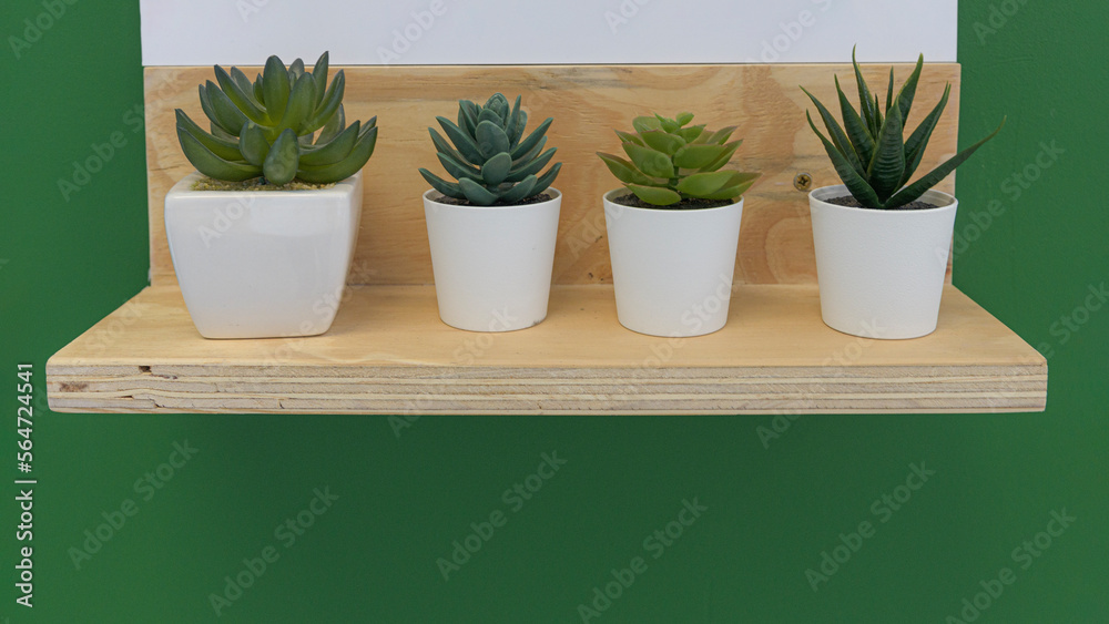 A simple neatly eco solution for a flower shelf. Shelf made of wooden slats. Cacti in small flower pots