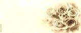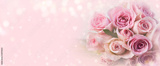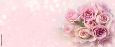 Bouquet of pink roses flowers on pastel pink bokeh background banner with hearts shape - Mother's Day, Valentine's Day, Wedding, Birthday and Happy Woman's Day. Panorama with copy space for your text