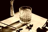 whisky drink on a wooden table with a barspoon and a jigger on black background