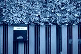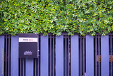 purple iron mailbox hanging on metal pastel purple fence with green leaves wall background. violet postbox on modern house door. letterbox mounted at entry gates of office.