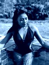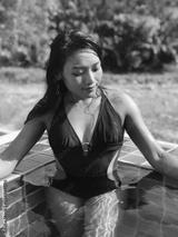 Young woman in swimsuit standing in blue pool. Girl in black swimwear relaxes at the swimming pool.
