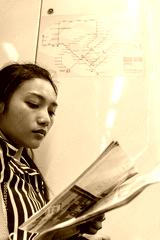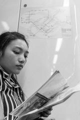 Asian tourist looks at the maps in the subway. A woman reading urban transport plan. Girl goes by train and studying maps with notes.
