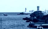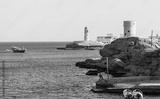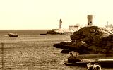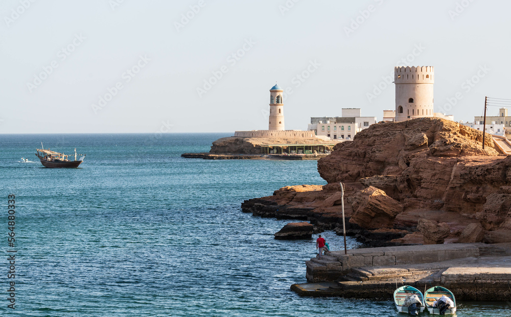 View of the Al Ayjah town, two watchtowers and a dhow under repair from the Khor Al Batah bridge in Sur, Oman