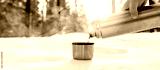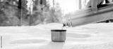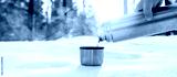 Metal thermos with a hot drink on the background of a winter mountain waterfall. Insulated drink container in the snow