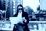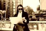 Young hispanic businesswoman working using laptop sitting on bench in Mexico city in Latin America
