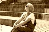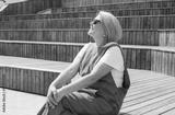 Dreamy old lady relaxing in city park. Pensive senior grey haired woman in casual sitting wooden bench tribune outdoors.