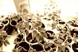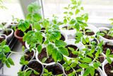 Young tomato sprouts in pots on the windowsill. Plants in a seedling tray close-up.