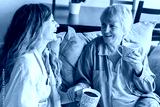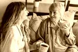 Happy adult daughter and senior mother having fun enjoying talk sit on sofa at home