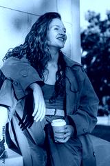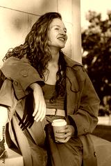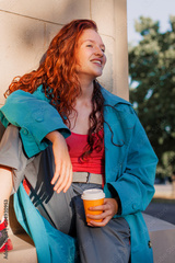 Stylish happy young woman with up of coffee walking in city