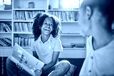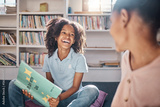 Education, storytelling or happy students in a library or classroom or for learning development. Smile, kids or excited young children reading funny fantasy or English literature books at school