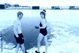 Winter swimming. Young couple ready to swim in ice water. Tea after plunge in cold water. Man and woman wrapped in a towel and swimming clothes. Hat and gloves. People and nature lake in the city