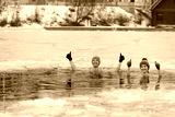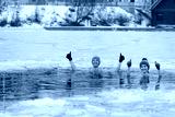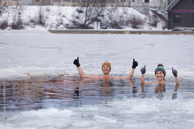 Winter swimming. Young couple ready to swim in ice water. Tea after plunge in cold water. Man and woman wrapped in a towel and swimming clothes. Hat and gloves. People and nature lake in the city