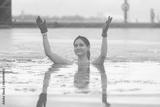 Winter swimming. Woman in frozen lake ice hole. Swimmers wellness in icy water. How to swim in cold water. Beautiful young female in zen meditation. Gray hat and gloves swimming clothes. Nature lake