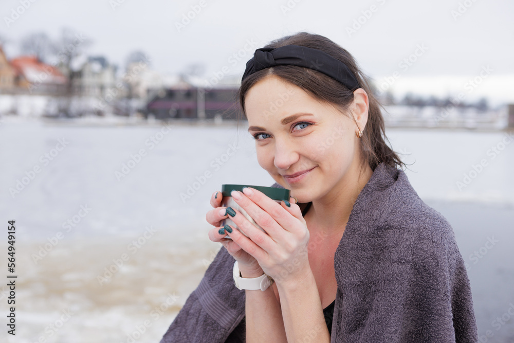 Beautiful young female smiling and drinking tea in nature Winter swimming. Woman in frozen lake ice hole. Swimmers wellness in icy water. How to swim in cold water Gray hat and gloves swimming clothes