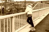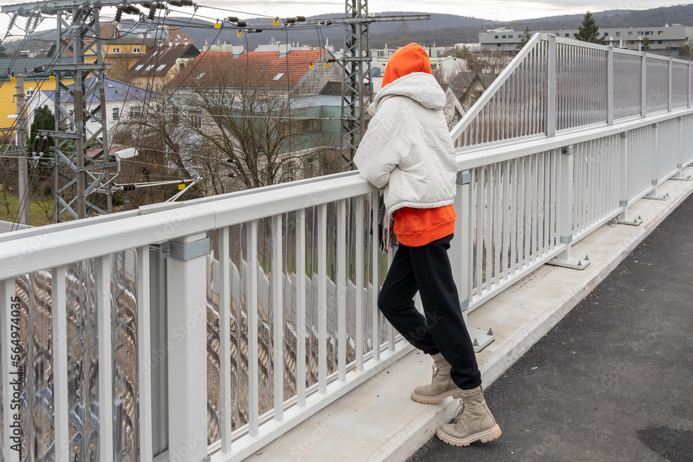 A slender, lonely young woman stands on a pedestrian bridge leaning on the railing, a view from the back.