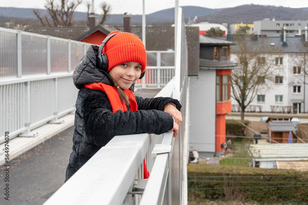 An 11-year-old girl in a red hat and headphones on a pedestrian bridge smiles and looks at the camera.