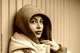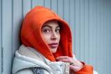 Portrait of a beautiful woman 25-30 years old in a jacket and an orange hood leaning against metal shutters.