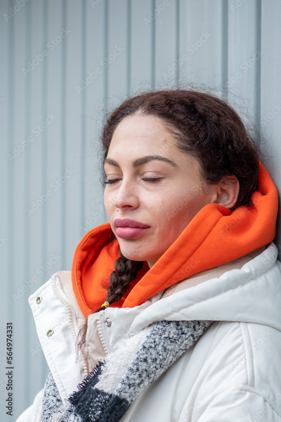 A beautiful 25-30-year-old woman leaned against metal shutters with her eyes closed. Perhaps she is very tired and upset, wants to cry.