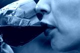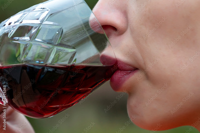 A woman with enlarged lips drinks wine from a glass against a blurry background of nature.