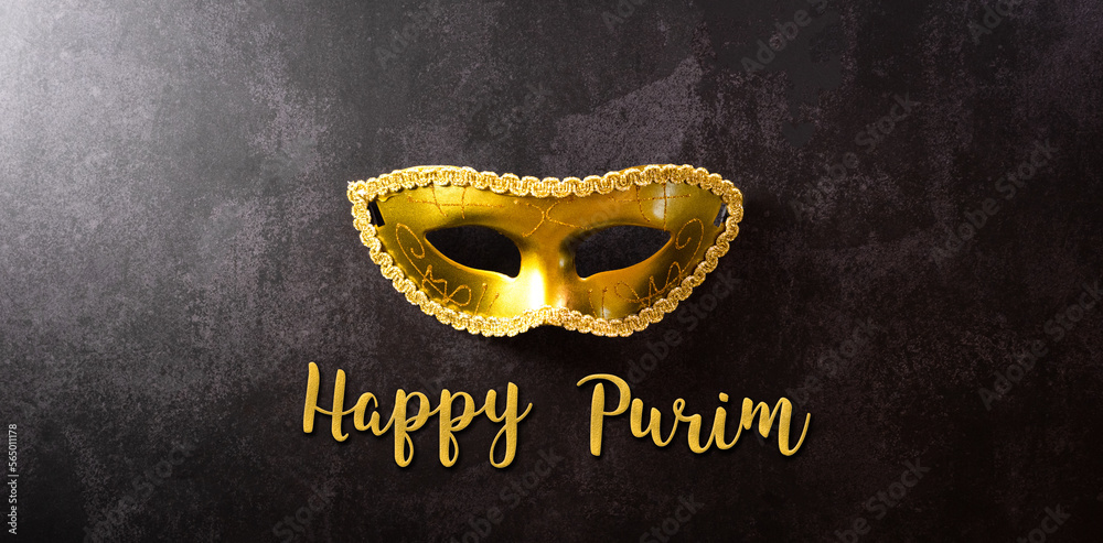 Happy Purim carnival decoration concept made from golden mask on dark background. (Happy Purim in Hebrew, jewish holiday celebrate)