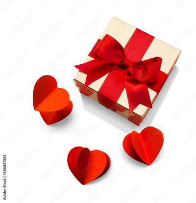 golden Valentine's Day gift box with a beautiful bow and red heart design element isolated on white background. Transparent background PNG