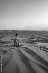 A woman dressed like a princess in a desert during sunset. Dubai, UAE.