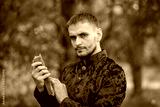 A young man in medieval brown clothes stands with an old book in his hand. A guy in a historical costume in nature.