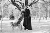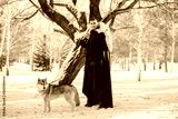Handsome male warrior with a sword in winter near a snow-covered tree with a wolf. The guy with the husky in the forest in a raincoat.